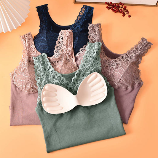 Cotton terry lace slim thermal seamless underwear soft women winter V-neck vest with removable pad